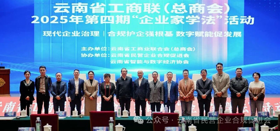 2025年11月14日,由云南省工商业联合会(总商会)主办,云南省民营企业合规促进会、云南省智能与数字经济协会协办的2025年第四期“企业家学法”活动在云南海埂会堂隆重举行。本次会议以“现代企业治理:合规护企强根基 数字赋能促发展”为主题,汇聚了政商学界精英250余位,共同探讨企业合规治理与数字化转型的前沿路径,为民营企业高质量发展注入新动能。